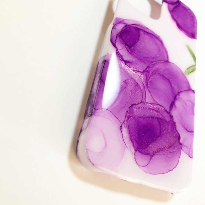直接スマホケースに描き、レジンコーティングでツヤツヤの仕上がりになります。