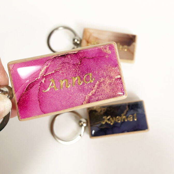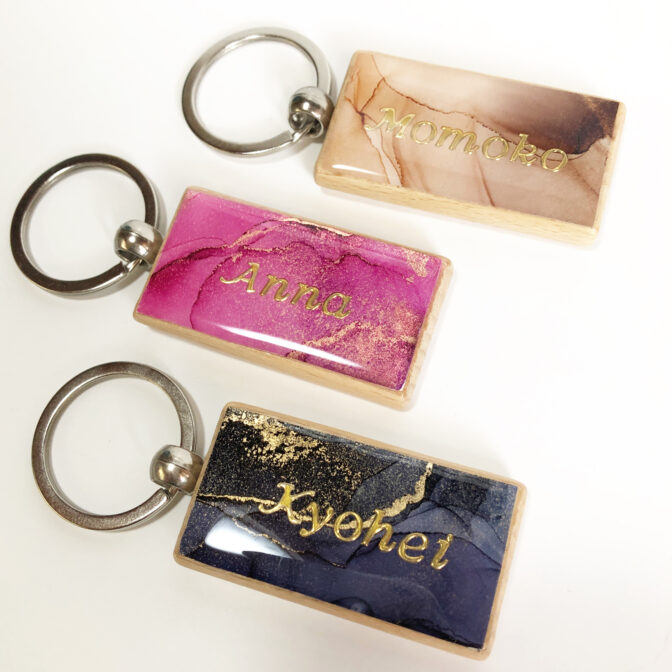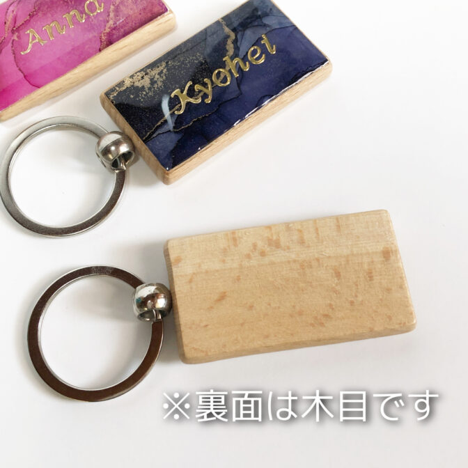 名入れ可能のアルコールインクアートを施した木製のネームキーホルダーです。