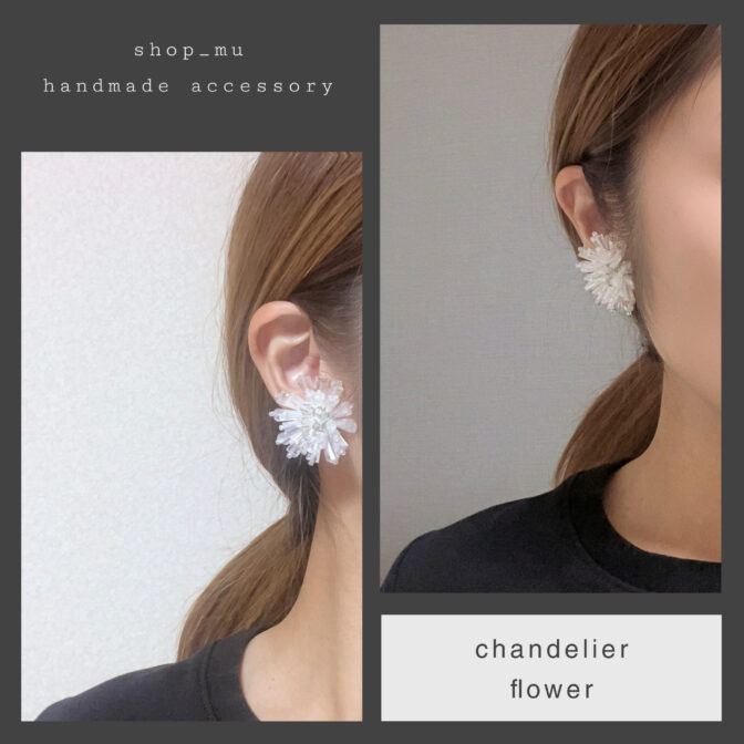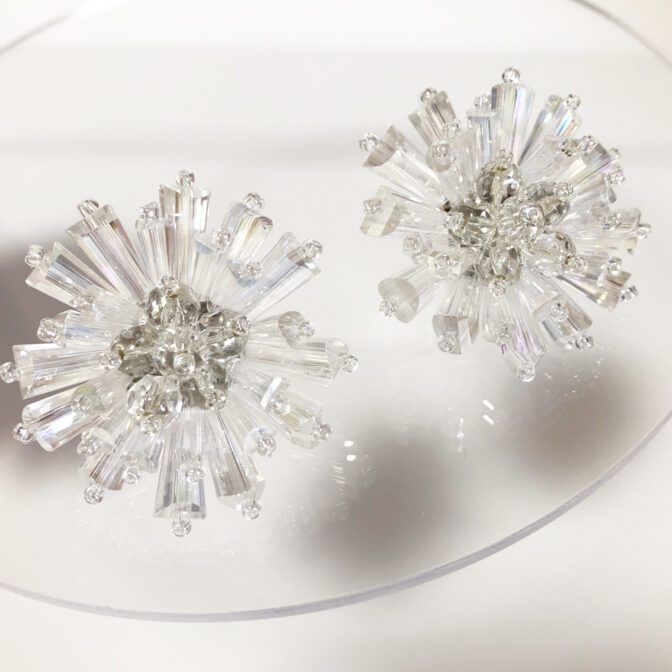 オーロラカラーのビーズでシャンデリアのようなお花を編みました。